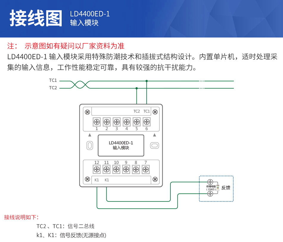 1、二總線,無極性。 2、LD4400ED-1輸入模塊采用電子編碼,占一個節(jié)點地址(0~255)。 3、單色指示燈顯示動作信息。 4、可接收一路無源開關(guān)接點信號。 5、LD4400ED-1輸入模塊可檢測無源開關(guān)接點線路斷線故障。 6、可替代利達的LD4400E-1輸入模塊。