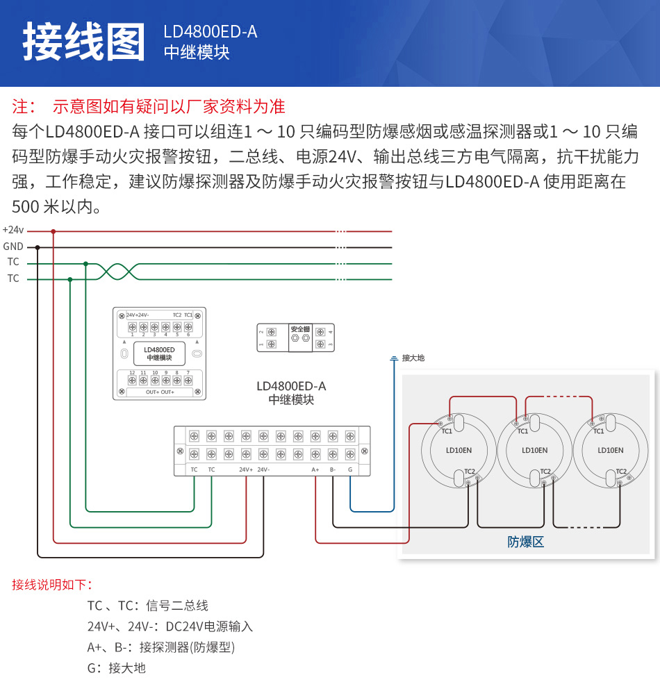 3、建議防爆探測(cè)器及防爆手動(dòng)火災(zāi)報(bào)警按鈕與LD4800ED-A使用距離在500米以內(nèi)。