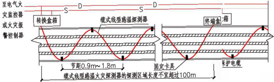 隧道內(nèi)應(yīng)沿電纜設(shè)置線型感溫火災(zāi)探測器,且在電纜接頭端子等發(fā)熱部位應(yīng)保證有效度;隧道內(nèi)設(shè)置的線型感溫火災(zāi)探測器可接入電氣火災(zāi)監(jiān)控系統(tǒng)。無外部火源進(jìn)入的電纜隧道應(yīng)在電纜層上表面設(shè)置線型感溫火災(zāi)探測器;有源入可能的電纜隧道在電纜層上表面和隧道頂部,均應(yīng)設(shè)置線型感溫火災(zāi)探測器。線型感溫火災(zāi)探測器采用“S”形布置或有外部火源進(jìn)入可能的電纜隧道內(nèi),能響應(yīng)火焰規(guī)模不大于100mm 的線型感溫火災(zāi)探測器。如圖3所示: