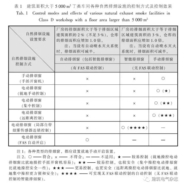 為方便理解和分析,下面以建筑面積大于5000m2丁類車間應(yīng)設(shè)排煙設(shè)施(以自然排煙設(shè)施)舉例,將設(shè)置自動(dòng)排煙窗、智能排煙窗和手動(dòng)排煙窗后的相關(guān)內(nèi)容,列表進(jìn)行說(shuō)明,如表1所示。